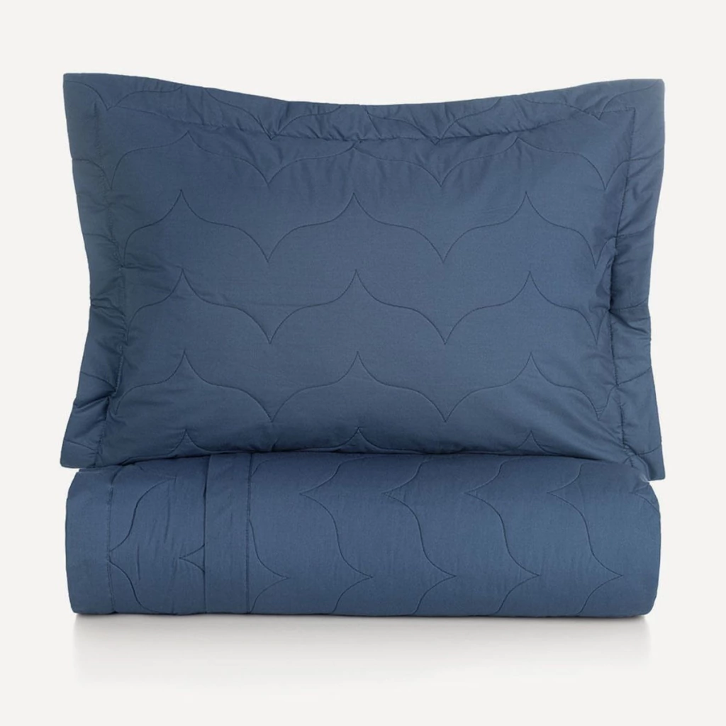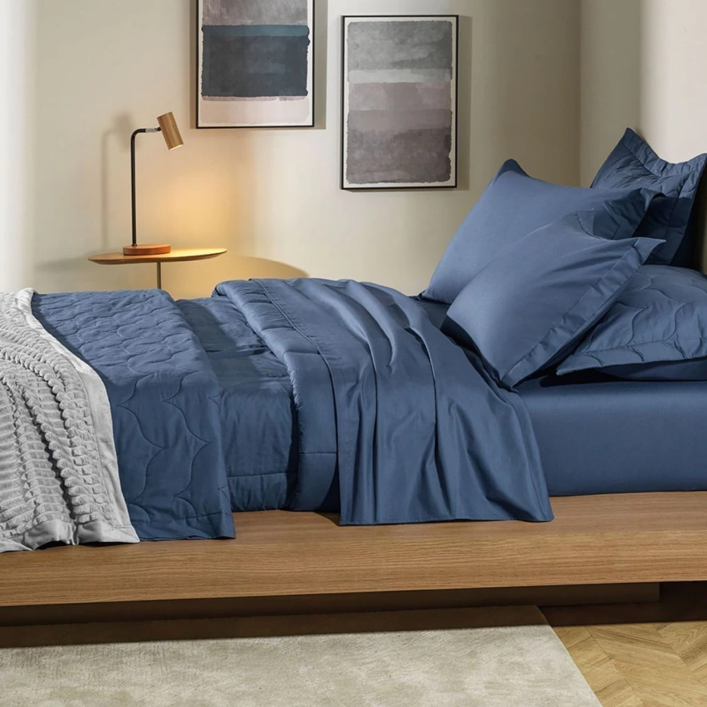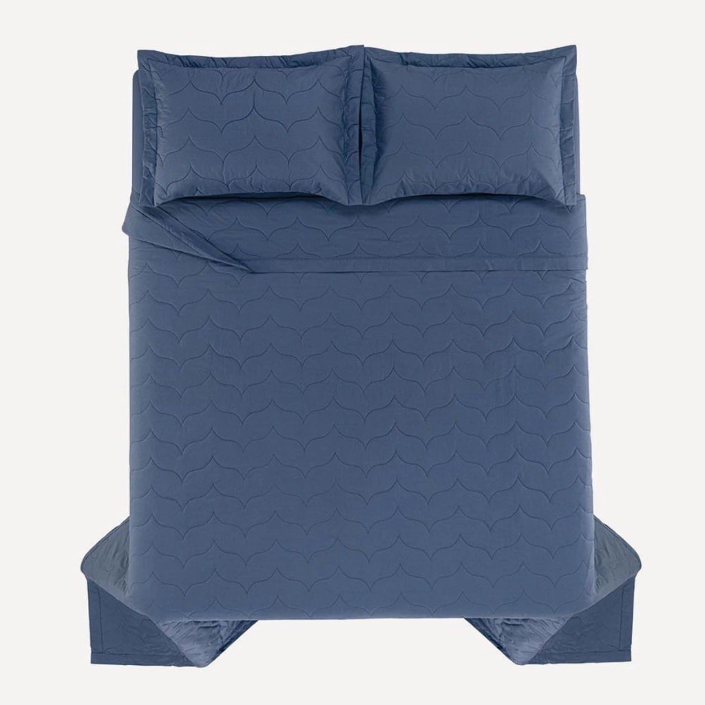 O acabamento matelassado com tecnologia termobond mantém o enchimento uniforme e garante maior durabilidade, enquanto o tecido percal soft proporciona uma textura encorpada e agradável. Os cantos quadrados da colcha reforçam o design moderno e elegante, tornando a peça um destaque no quarto.