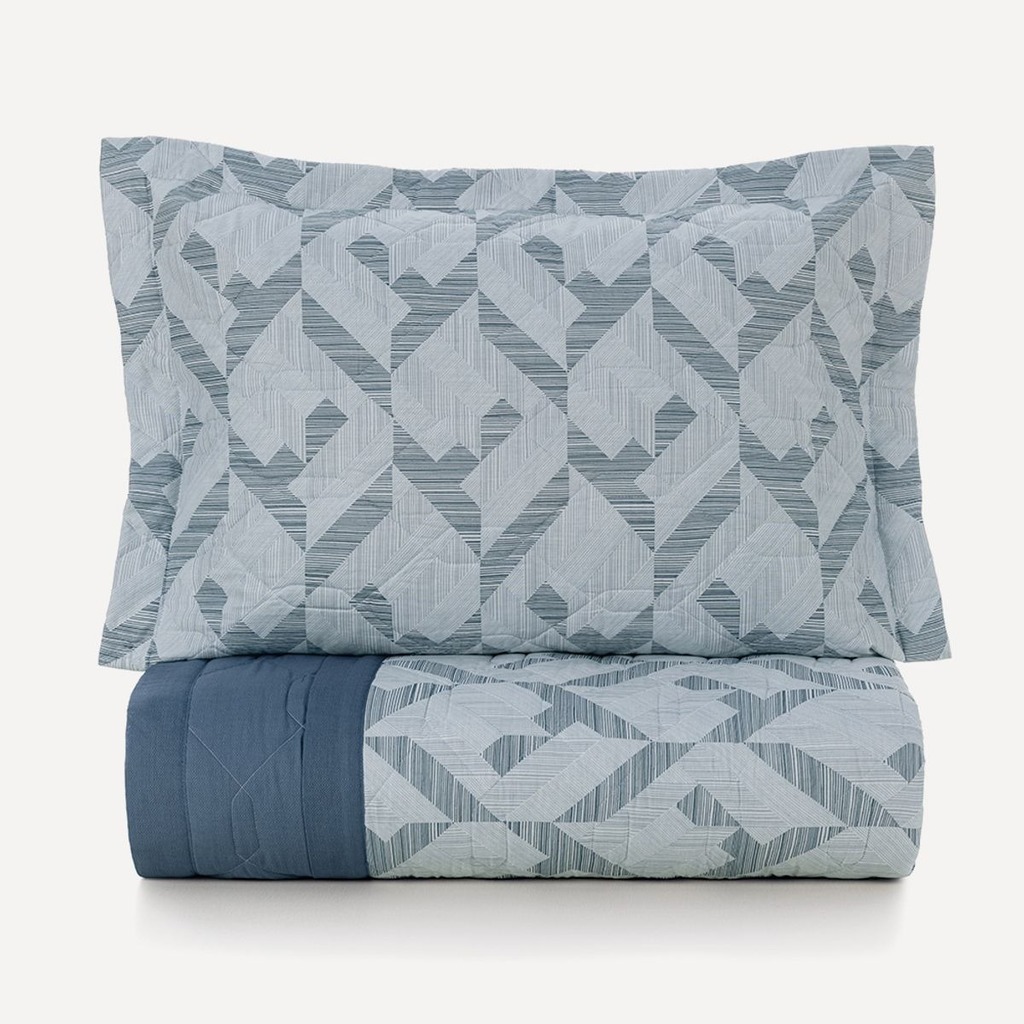 A Colcha Queen com 2 Porta-Travesseiros 100% Algodão Martin combina elegância e modernidade em uma proposta geométrica sofisticada. Com frente estampada em tons de azul e off-white e verso em azul escuro com textura em zigue-zague, o conjunto é dupla face, permitindo diferentes composições conforme o estilo desejado.