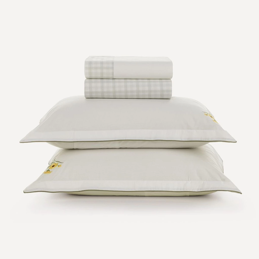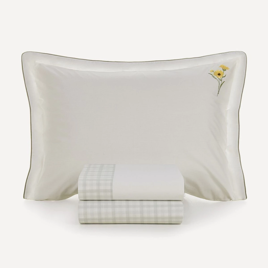 O lençol com elástico possui padronagem xadrez em verde menta, que adiciona textura e charme à cama. O sobrelençol traz corpo liso com pala estampada xadrez de 10 cm, garantindo um acabamento refinado. Já as fronhas são um destaque à parte, com base branca, bordado floral e cordonê aplicado nas três abas, reforçando o estilo artesanal e o cuidado nos detalhes.