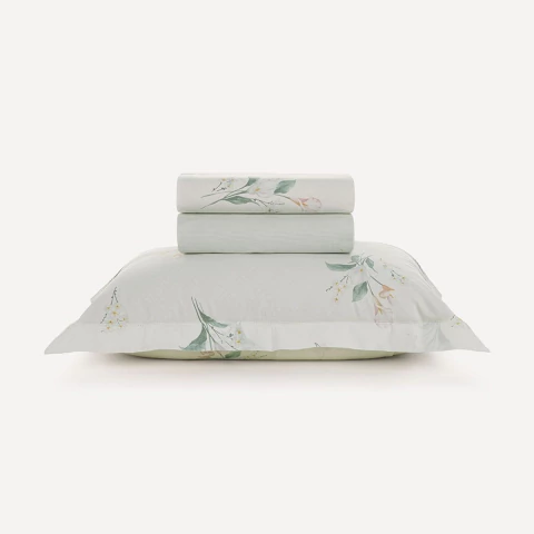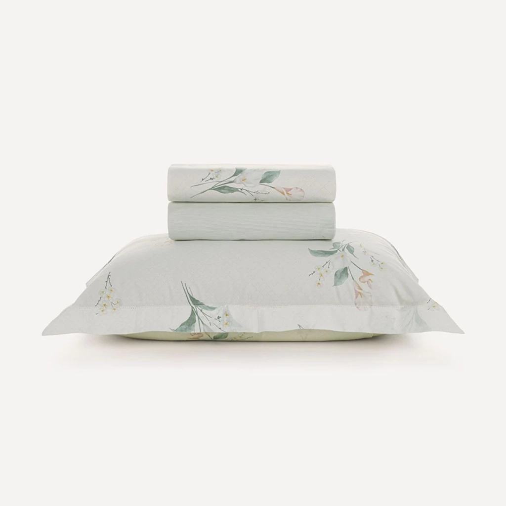 Para completar a composição, o lençol com elástico traz listras horizontais em verde claro, coordenando perfeitamente com o conjunto e adicionando um toque de cor suave e harmonioso. As fronhas estampadas possuem 3 abas de 5 cm e acabamento em ponto ajour aplicado nos três lados, reforçando a sofisticação e o cuidado artesanal do design.